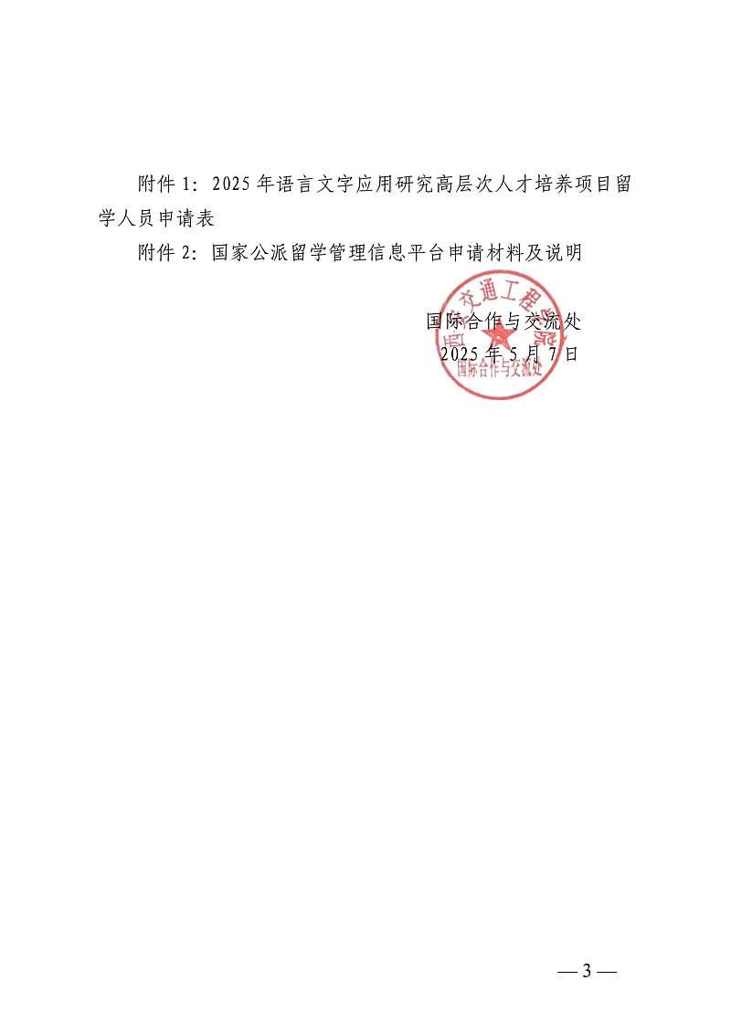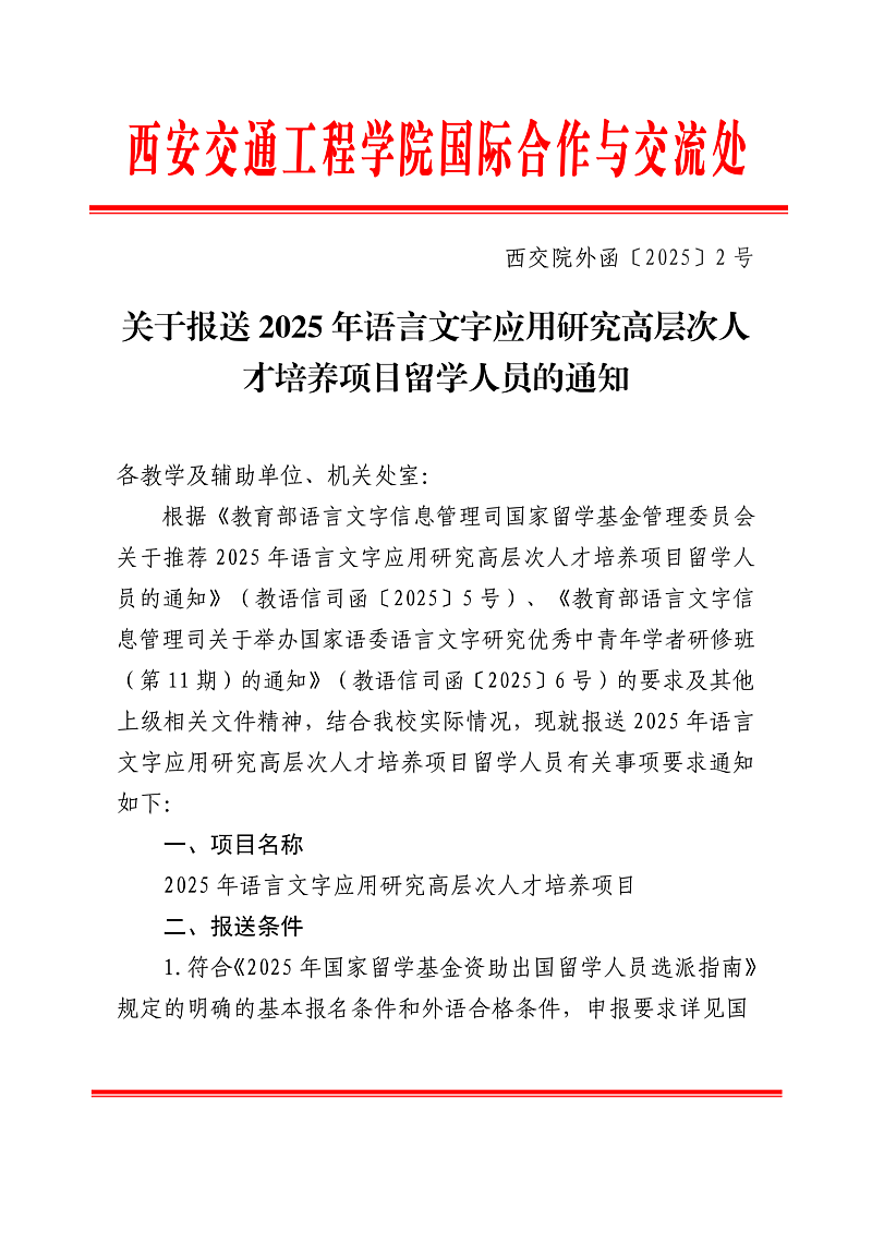 根据《教育部语言文字信息管理司国家留学基金管理委员会关于推荐2025年语言文字应用研究高层次人才培养项目留学人员的通知》(教语信司函〔2025〕5号)、《教育部语言文字信息管理司关于举办国家语委语言文字研究优秀中青年学者研修班(第11期)的通知》(教语信司函〔2025〕6号)的要求及其他上级相关文件精神,结合我校实际情况,现就报送2025年语言文字应用研究高层次人才培养项目留学人员有关事项要求通知如下: