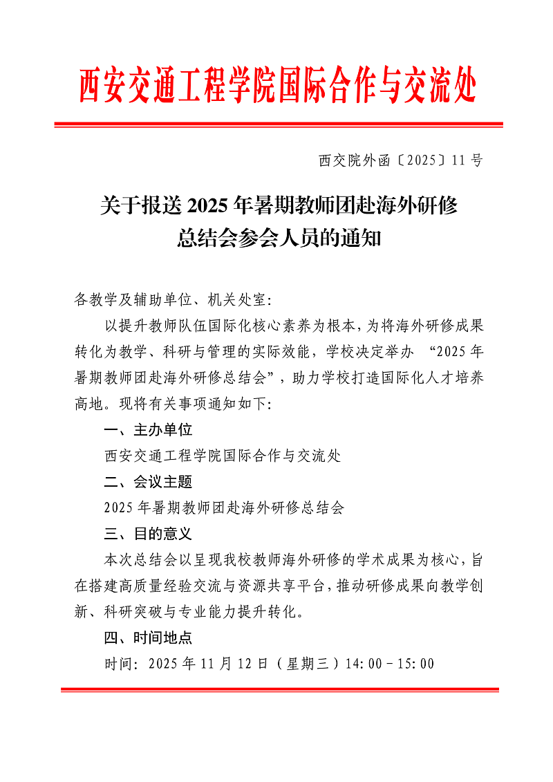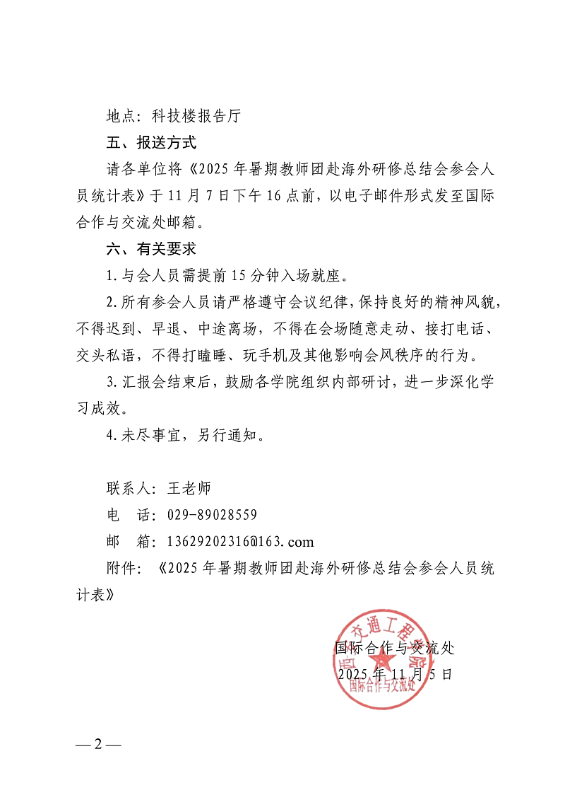 请各单位将《2025年暑期教师团赴海外研修总结会参会人员统计表》于11月7日下午16点前,以电子邮件形式发至国际合作与交流处邮箱。