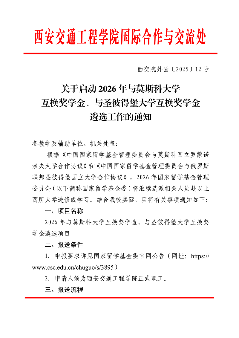 根据《中国国家留学基金管理委员会与莫斯科国立罗蒙诺索夫大学合作协议》和《中国国家留学基金管理委员会与俄罗斯联邦圣彼得堡国立大学合作协议》,2026年国家留学基金管理委员会(以下简称国家留学基金委)将继续选派相关人员赴以上两所大学进修或学习。结合我校实际,现将有关事项通知如下: