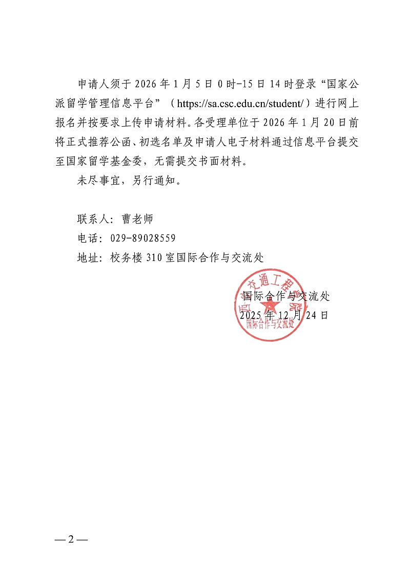 申请人须于2026年1月5日0时-15日14时登录“国家公派留学管理信息平台”(https://sa.csc.edu.cn/student/)进行网上报名并按要求上传申请材料。各受理单位于2026年1月20日前将正式推荐公函、初选名单及申请人电子材料通过信息平台提交至国家留学基金委,无需提交书面材料。