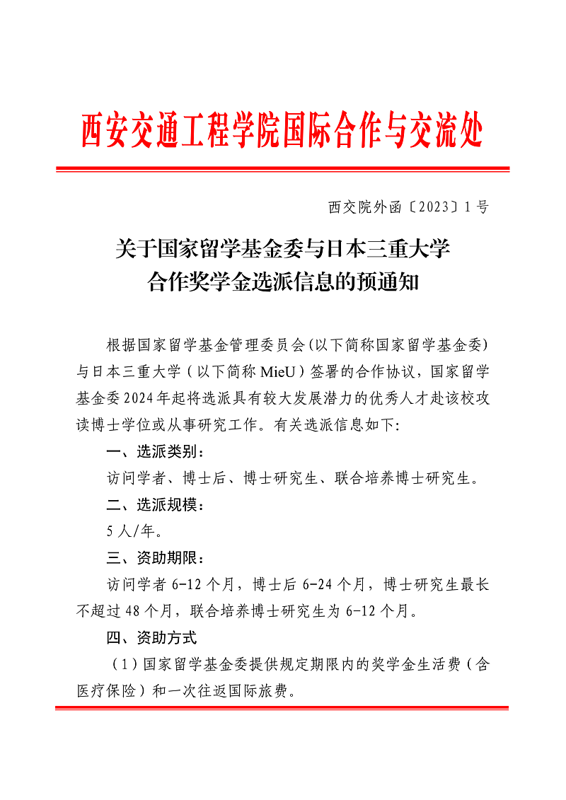 根据国家留学基金管理委员会(以下简称国家留学基金委)与日本三重大学(以下简称MieU)签署的合作协议,国家留学基金委2024年起将选派具有较大发展潜力的优秀人才赴该校攻读博士学位或从事研究工作。有关选派信息如下: