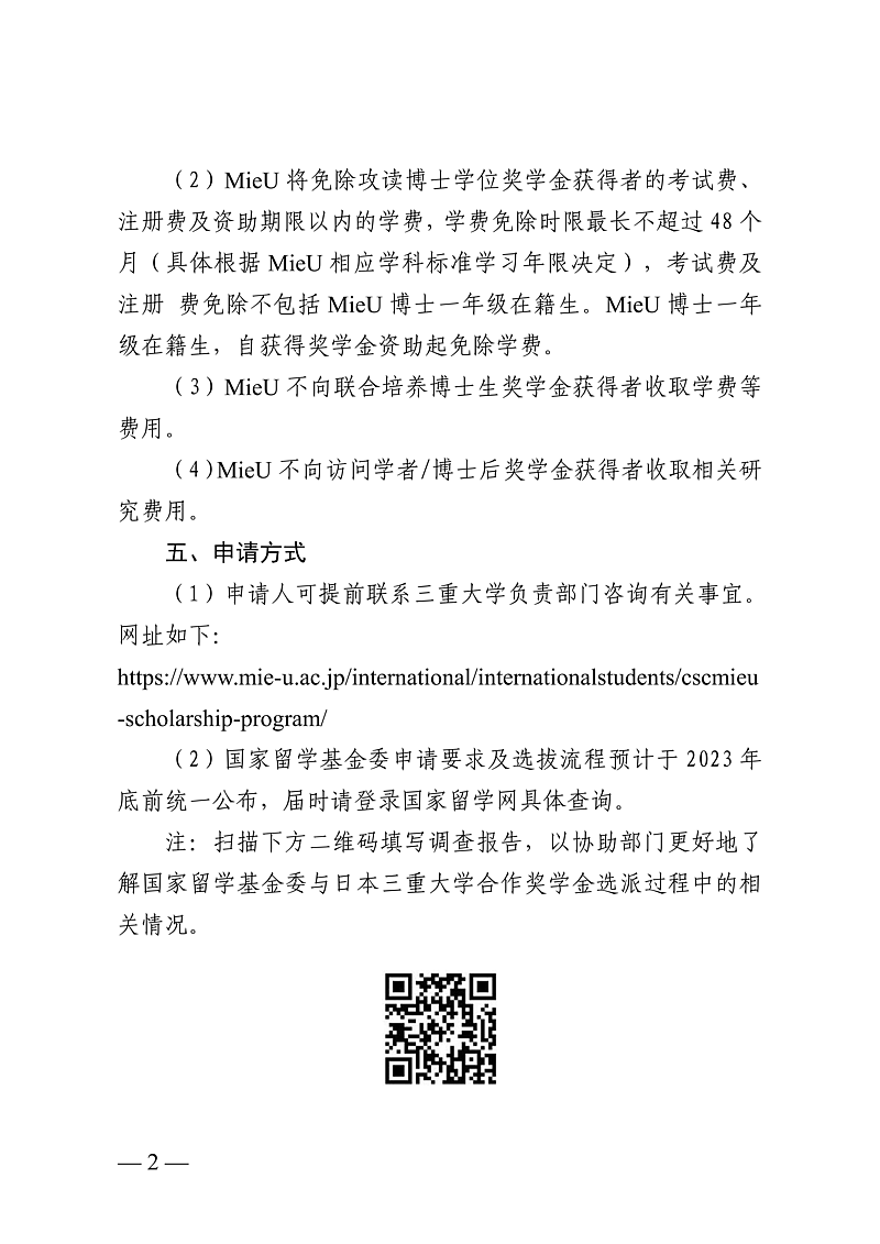 注:扫描下方二维码填写调查报告,以协助部门更好地了解国家留学基金委与日本三重大学合作奖学金选派过程中的相关情况。