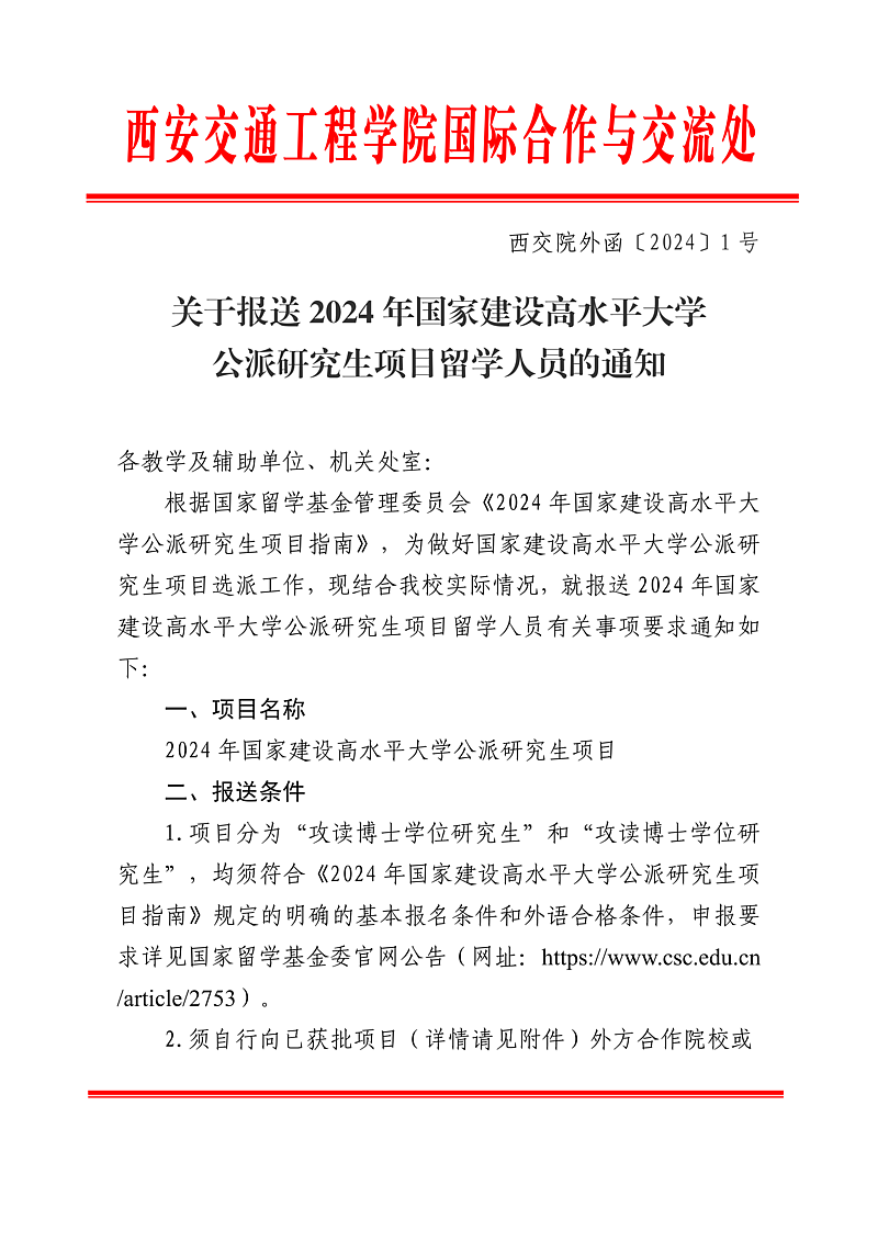 根据国家留学基金管理委员会《2024年国家建设高水平大学公派研究生项目指南》,为做好国家建设高水平大学公派研究生项目选派工作,现结合我校实际情况,就报送2024年国家建设高水平大学公派研究生项目留学人员有关事项要求通知如下: