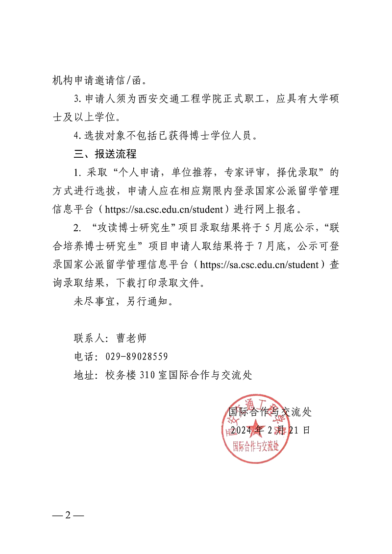 2.“攻读博士研究生”项目录取结果将于5月底公示,“联合培养博士研究生”项目申请人取结果将于7月底,公示可登录国家公派留学管理信息平台(https://sa.csc.edu.cn/student)查询录取结果,下载打印录取文件。