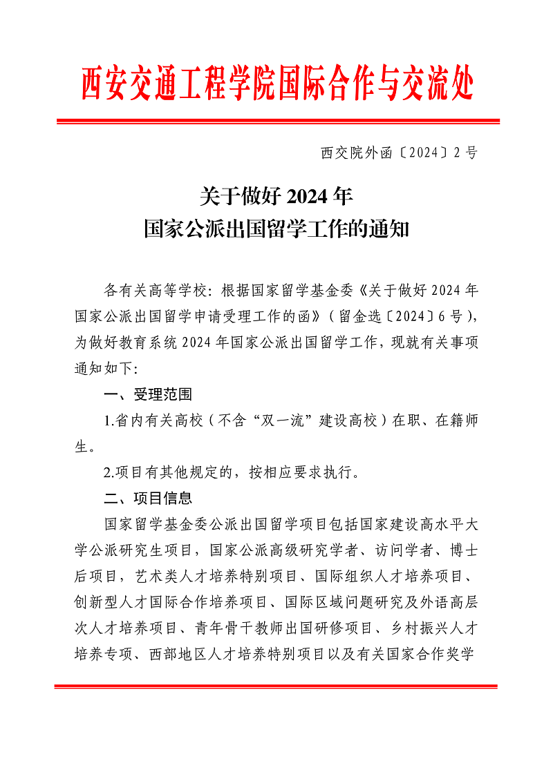 各有关高等学校:根据国家留学基金委《关于做好2024年国家公派出国留学申请受理工作的函》(留金选〔2024〕6号),为做好教育系统2024年国家公派出国留学工作,现就有关事项通知如下: