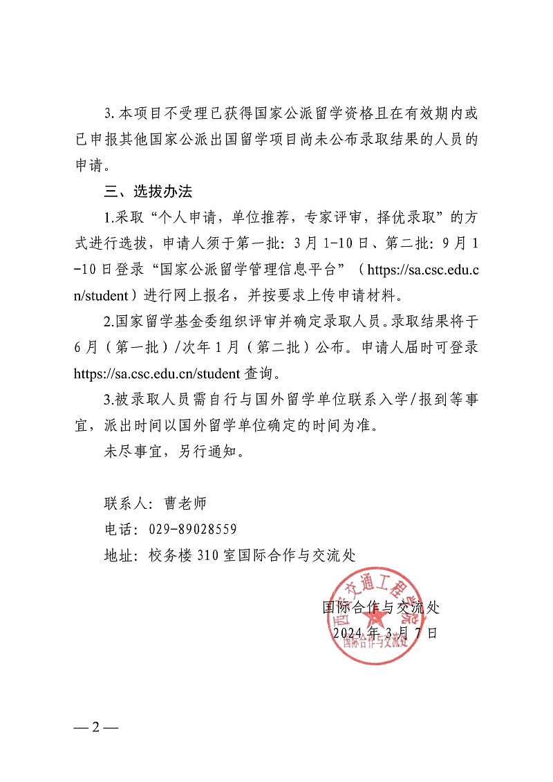 1.采取“个人申请,单位推荐,专家评审,择优录取”的方式进行选拔,申请人须于第一批:3月1-10日、第二批:9月1-10日登录“国家公派留学管理信息平台”(https://sa.csc.edu.cn/student)进行网上报名,并按要求上传申请材料。