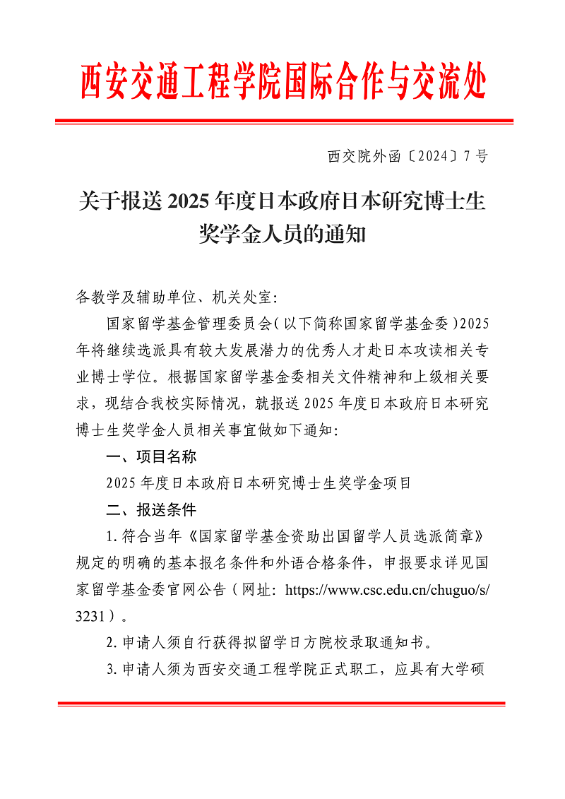 国家留学基金管理委员会(以下简称国家留学基金委)2025年将继续选派具有较大发展潜力的优秀人才赴日本攻读相关专业博士学位。根据国家留学基金委相关文件精神和上级相关要求,现结合我校实际情况,就报送2025年度日本政府日本研究博士生奖学金人员相关事宜做如下通知: