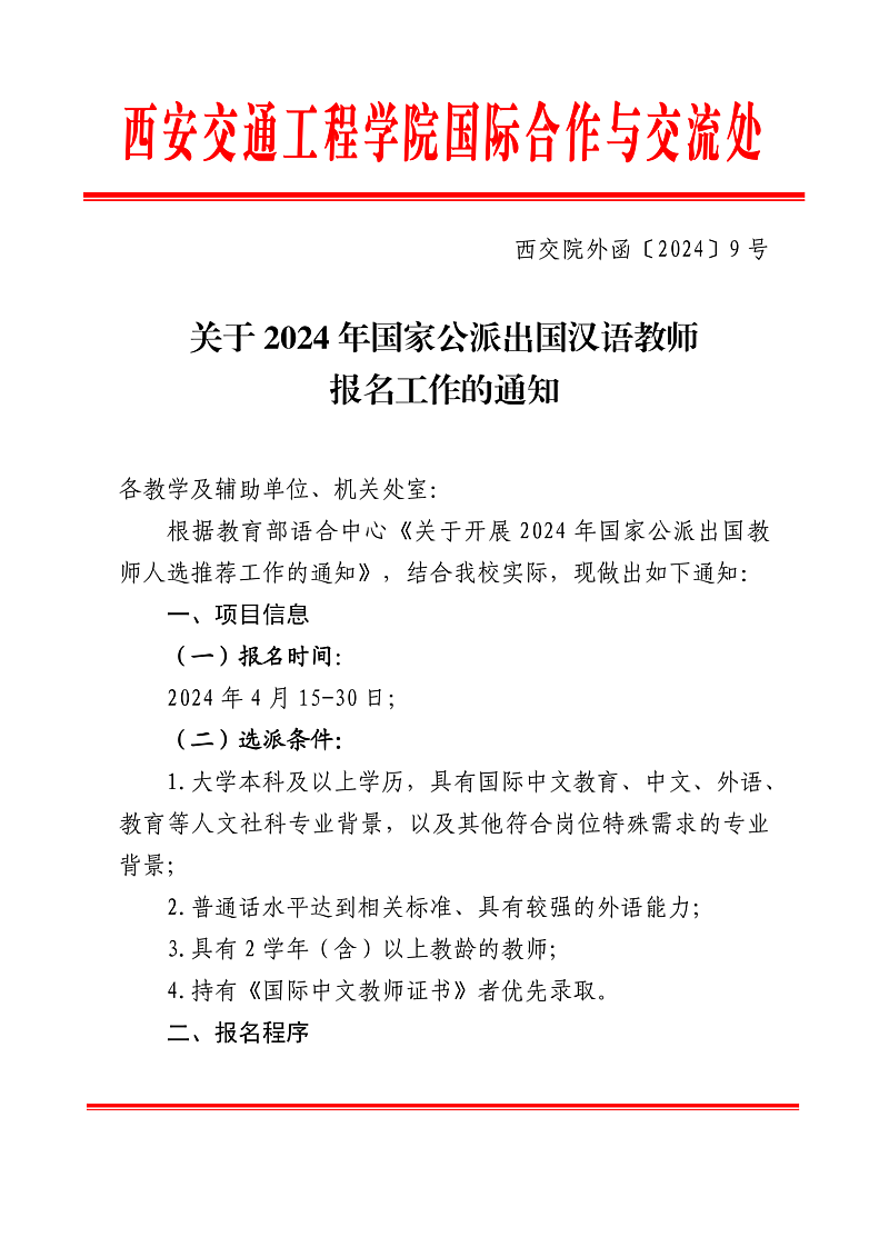 根据教育部语合中心《关于开展2024年国家公派出国教师人选推荐工作的通知》,结合我校实际,现做出如下通知: