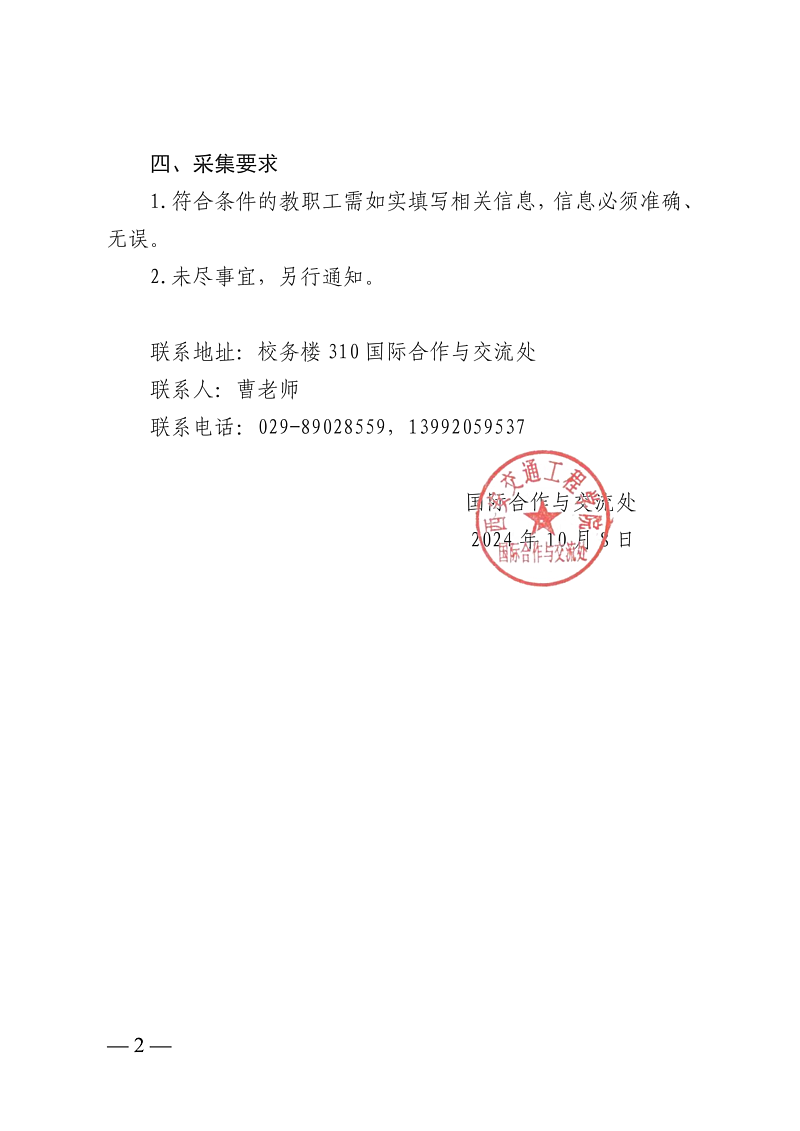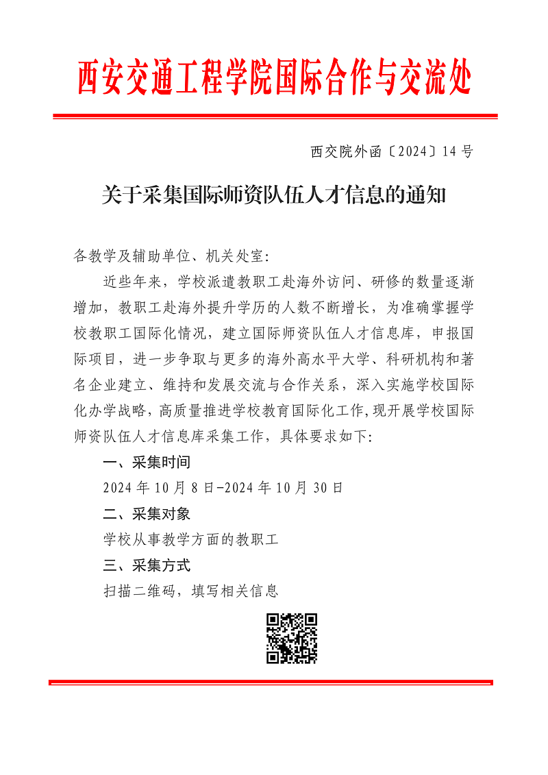 近些年来,学校派遣教职工赴海外访问、研修的数量逐渐增加,教职工赴海外提升学历的人数不断增长,为准确掌握学校教职工国际化情况,建立国际师资队伍人才信息库,申报国际项目,进一步争取与更多的海外高水平大学、科研机构和著名企业建立、维持和发展交流与合作关系,深入实施学校国际化办学战略,高质量推进学校教育国际化工作,现开展学校国际师资队伍人才信息库采集工作,具体要求如下: