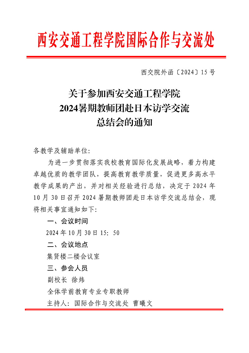 为进一步贯彻落实我校教育国际化发展战略,着力构建卓越优质的教学团队,提高教育教学质量,促进更多高水平教学成果的产出,并对相关经验进行总结,决定于2024年10月30日召开2024暑期教师团赴日本访学交流总结会,现将相关事宜通知如下: