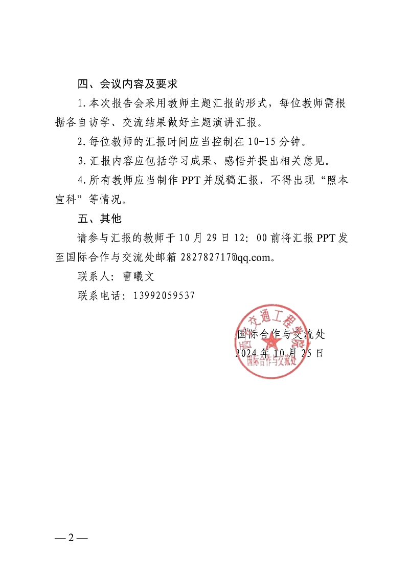 请参与汇报的教师于10月29日12:00前将汇报PPT发至国际合作与交流处邮箱282782717@qq.com