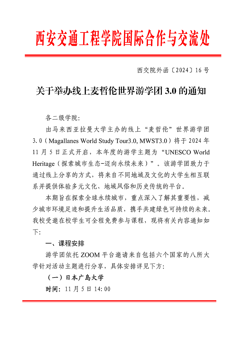 由马来西亚拉曼大学主办的线上“麦哲伦”世界游学团3.0(Magallanes World Study Tour3.0, MWST3.0)将于2024年11月5日正式开启,本年度的游学主题为“UNESCO World Heritage(探索城市生态-迈向永续未来)”。该游学团致力于通过线上分享的方式,将来自不同地域及文化的大学生相互联系并提供体验多元文化、地域风俗和历史传统的平台。