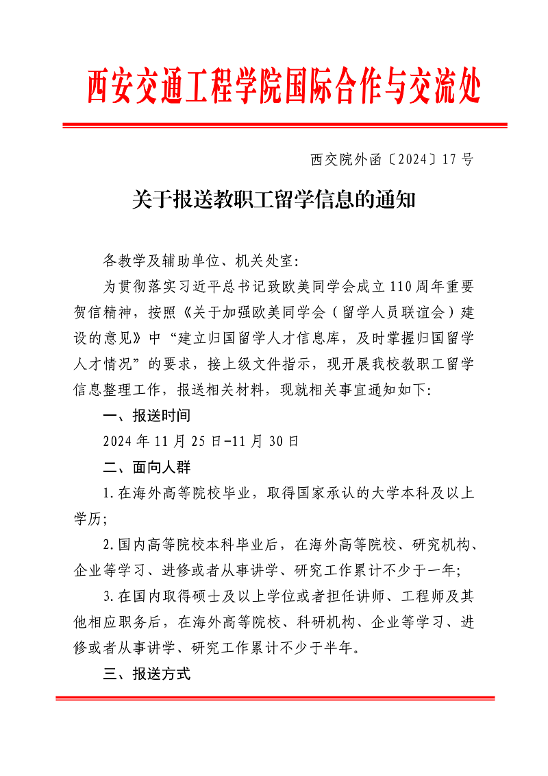 为贯彻落实习近平总书记致欧美同学会成立110周年重要贺信精神,按照《关于加强欧美同学会(留学人员联谊会)建设的意见》中“建立归国留学人才信息库,及时掌握归国留学人才情况”的要求,接上级文件指示,现开展我校教职工留学信息整理工作,报送相关材料,现就相关事宜通知如下: