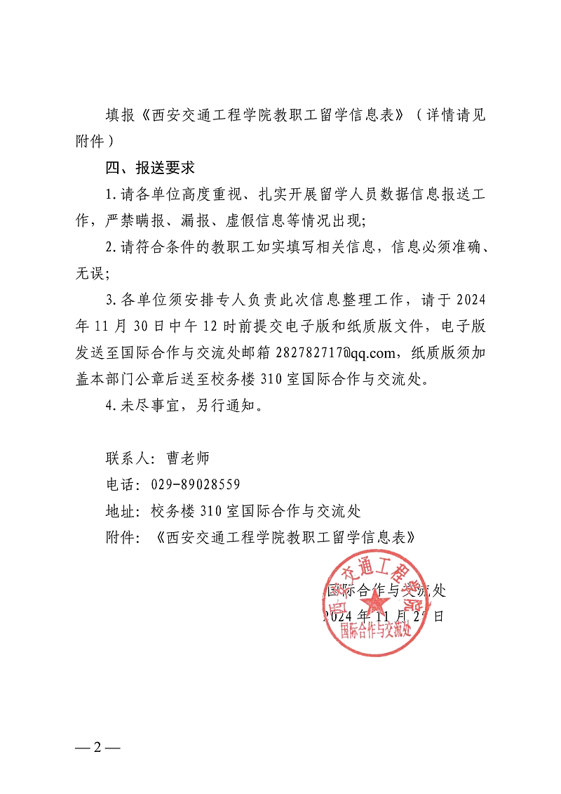 3.各单位须安排专人负责此次信息整理工作,请于2024年11月30日中午12时前提交电子版和纸质版文件,电子版发送至国际合作与交流处邮箱 282782717@qq.com,纸质版须加盖本部门公章后送至校务楼310室国际合作与交流处。