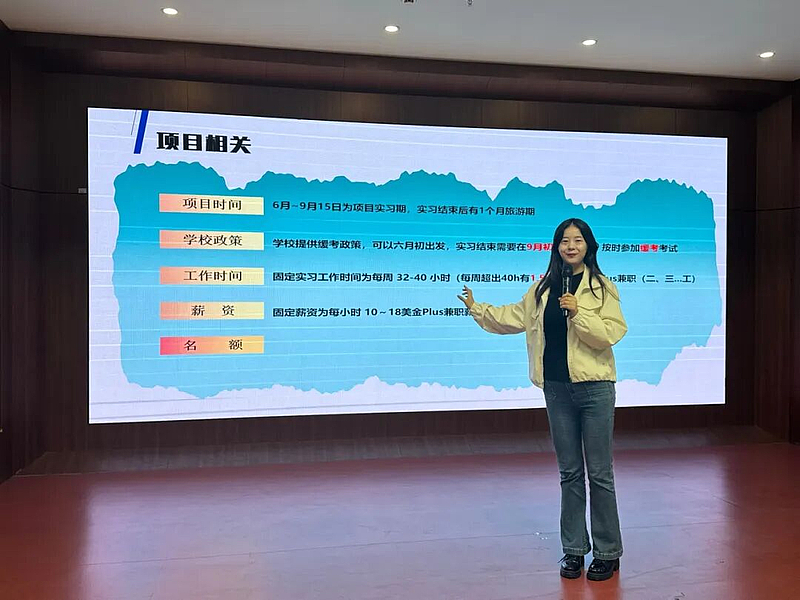 马妮妮老师对赴美带薪实习项目(Summer Work & Travel USA,简称“SWT”)进行了全面介绍。她指出,该项目是经美国政府核准的国际青年文化交流项目,面向全球18至28周岁的全日制在校大学生。自2007年引入中国以来,已为众多符合条件的中国学生提供了在美国零售、餐饮、酒店、度假胜地等企业进行短期暑期工作的机会,真正实现“在工作中交流,在旅行中成长”。宣讲会中,马老师详细解读了实习岗位内容、在美生活安排、项目相关费用以及具体的申请条件与流程,并鼓励同学们提前准备,积极抓住这一开拓视野、锻炼自我的宝贵机会。