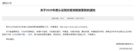 今年9月,中国教育部留学服务中心曾对世界各国高校学历认证名单进行了重大调整,有媒体盘点统计,本次更新的认证名单,总共有270所大学被移出认证名单。